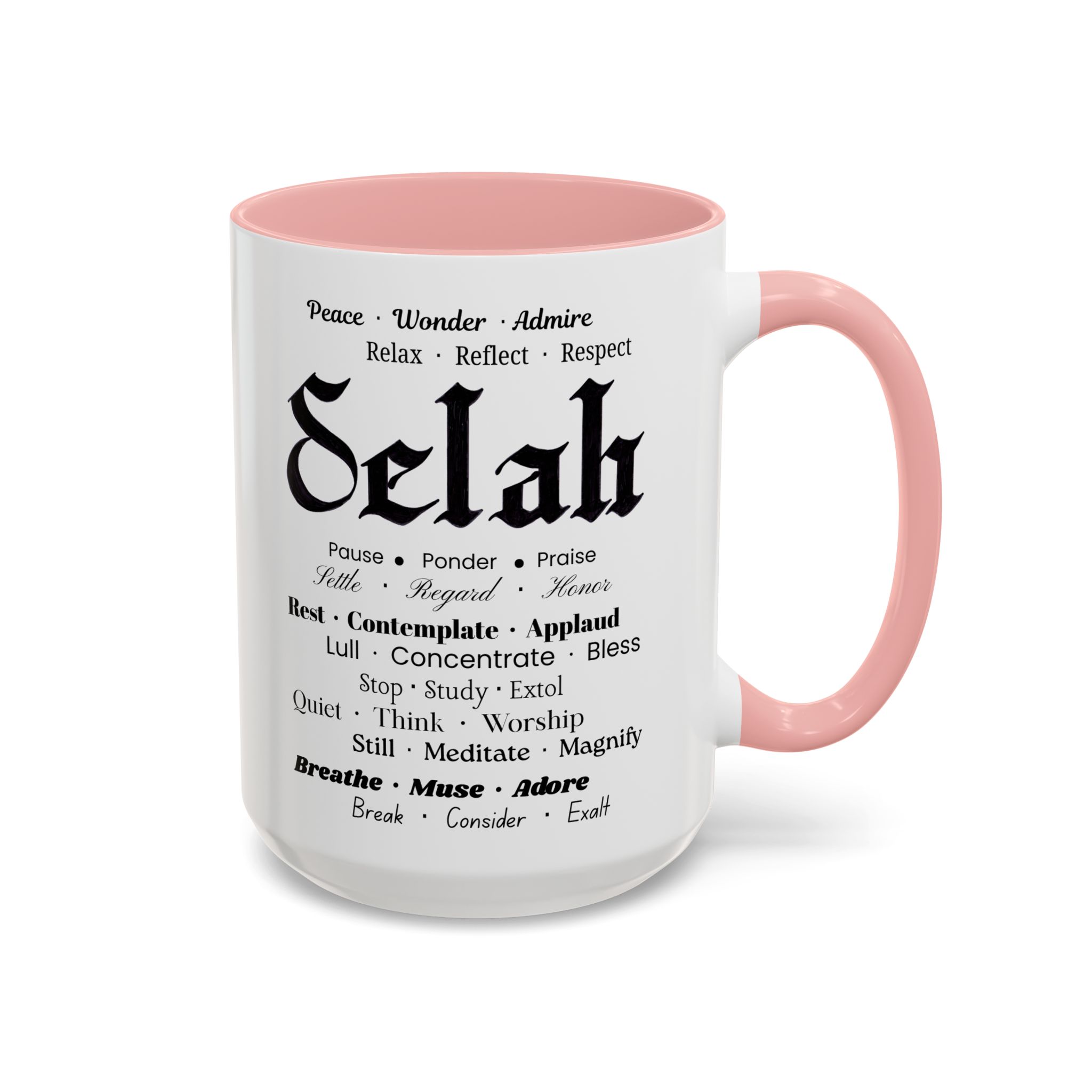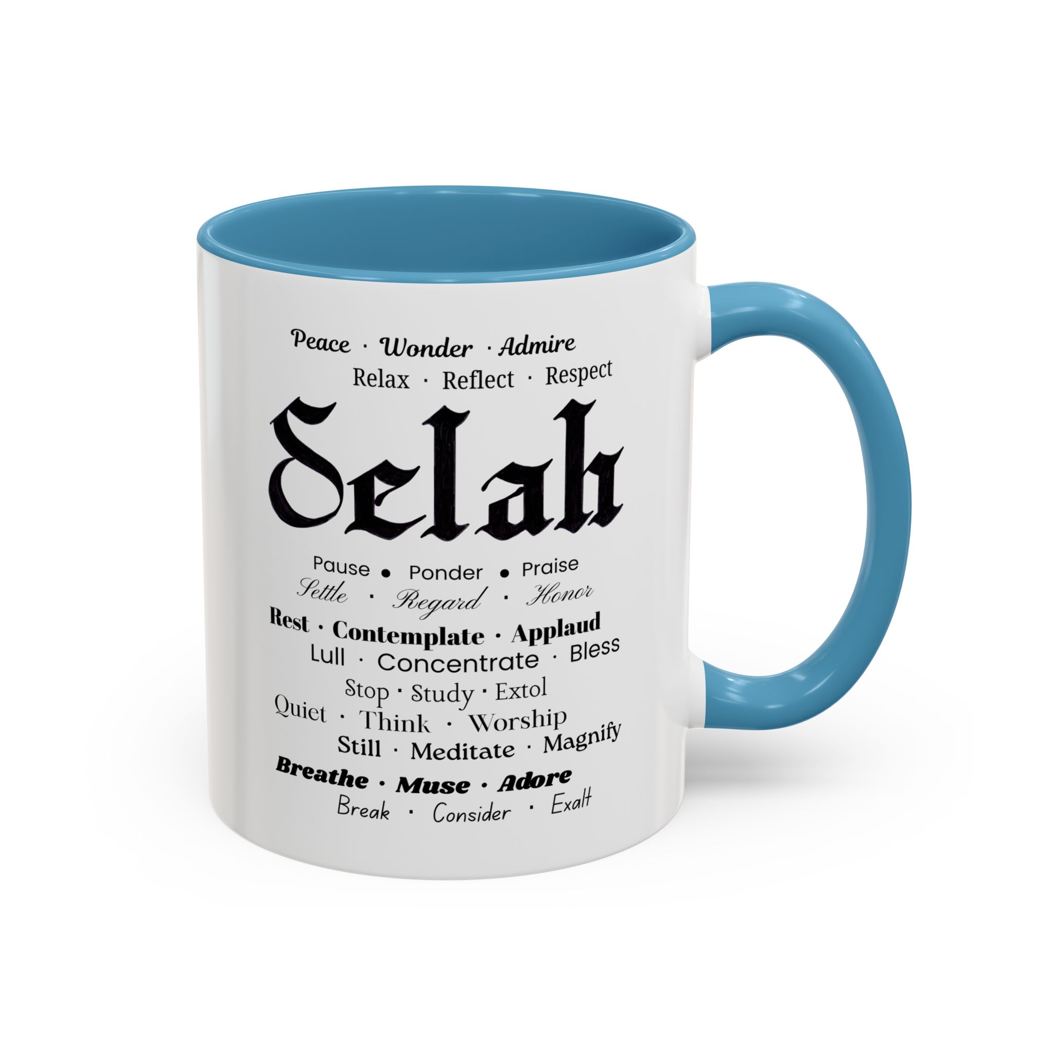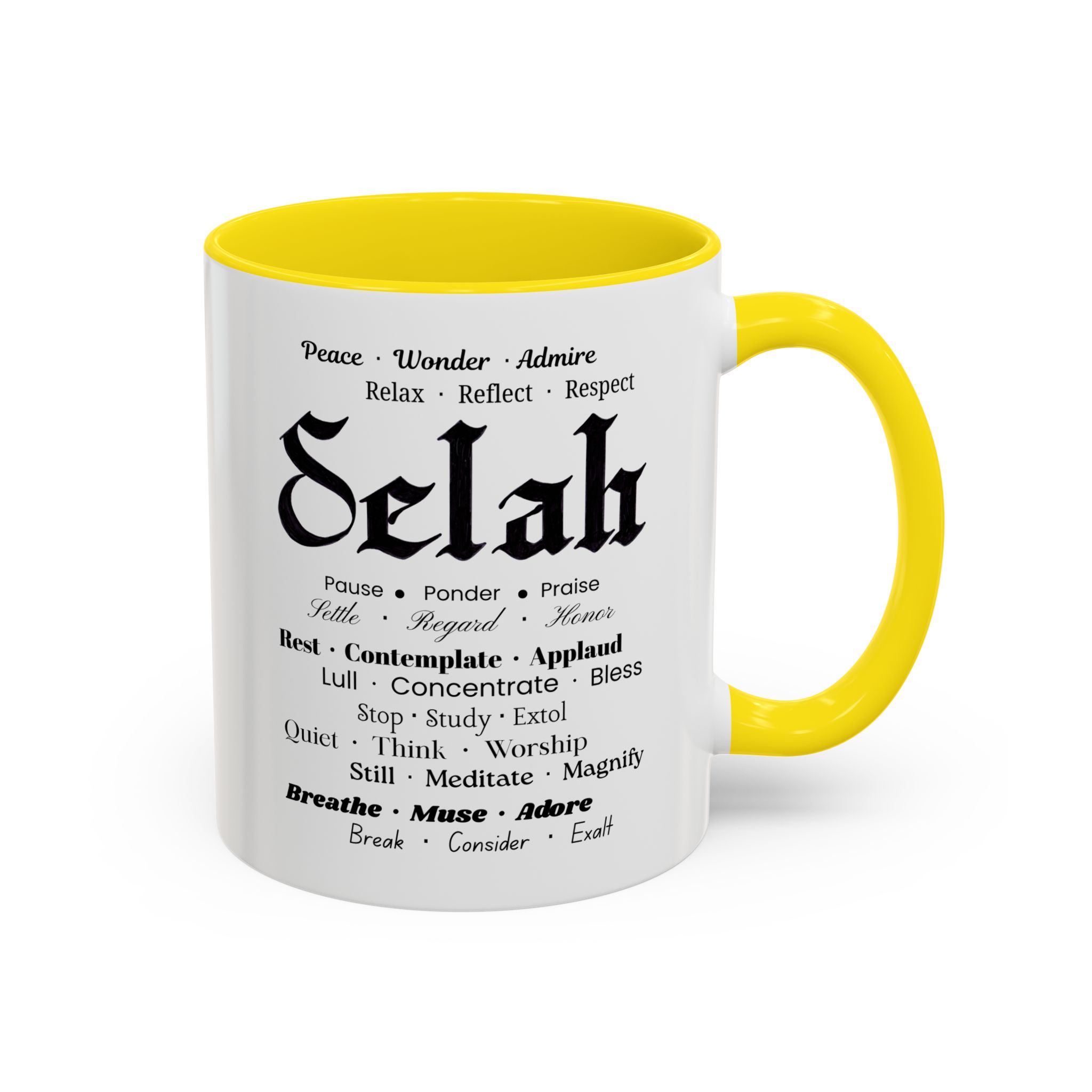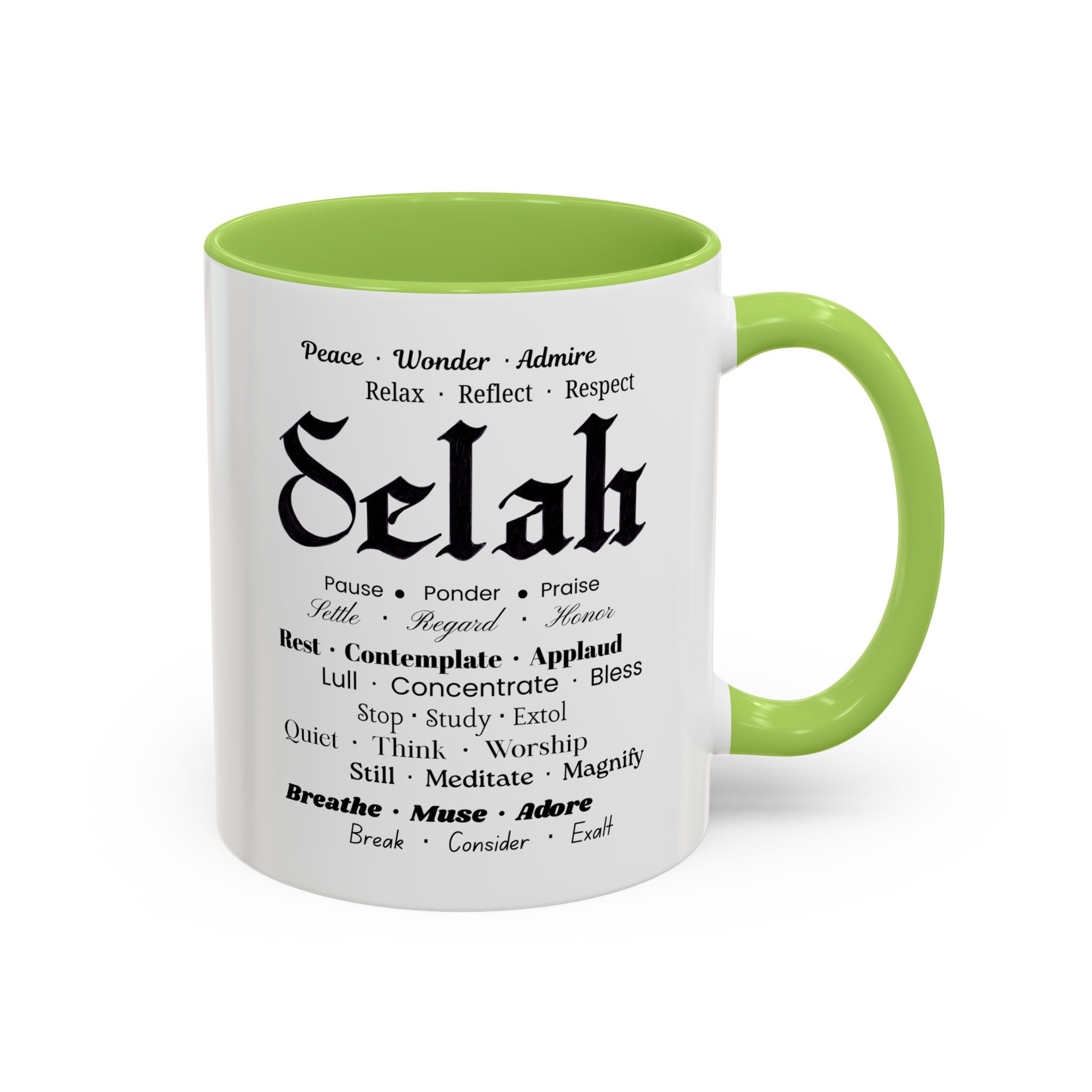 Christian inspirational ceramic coffee mug in two sizes and multiple color accent options. Original was hand lettered in Fraktur blackletter script, now printed with multiple three-words variations which hint at the significance of this one word: Selah. Delightful influence toward thoughtful thanksgiving for the God of creation. Perfect gift for someone who could use the prompts to relax and let their faith be inspired. Brighten your mornings with this vibrant, faith-inspiring ceramic coffee mug, designed to promote positive thoughts and elevate your morning coffee and Bible reading time. Its colorful interior and handle create an eye-catching contrast to the black and white design, adding a splash of fun to your day. Elegant yet practical, this mug makes for a wonderful cup of coffee, hot chocolate, or tea. Crafted from durable ceramic, this mug is both microwave and dishwasher safe, making it perfect for busy lifestyles. Ideal for coffee lovers and tea enthusiasts alike, it fits seamlessly into any home or office. Perfect for gifting on occasions such as birthdays, holidays, or just to uplift a friend. Embrace the bold colors and glossy finish, and let this mug be a conversation starter at your next gathering. Product features – Microwave-safe for convenient heating – Dishwasher-safe for easy cleaning – Vibrant colors from advanced printing techniques – Available in two sizes: 11oz and 15oz Multiple accent colors for the black on white design. – Lead and BPA-free for safe use Care instructions – Clean in dishwasher or wash by hand with warm water and dish soap