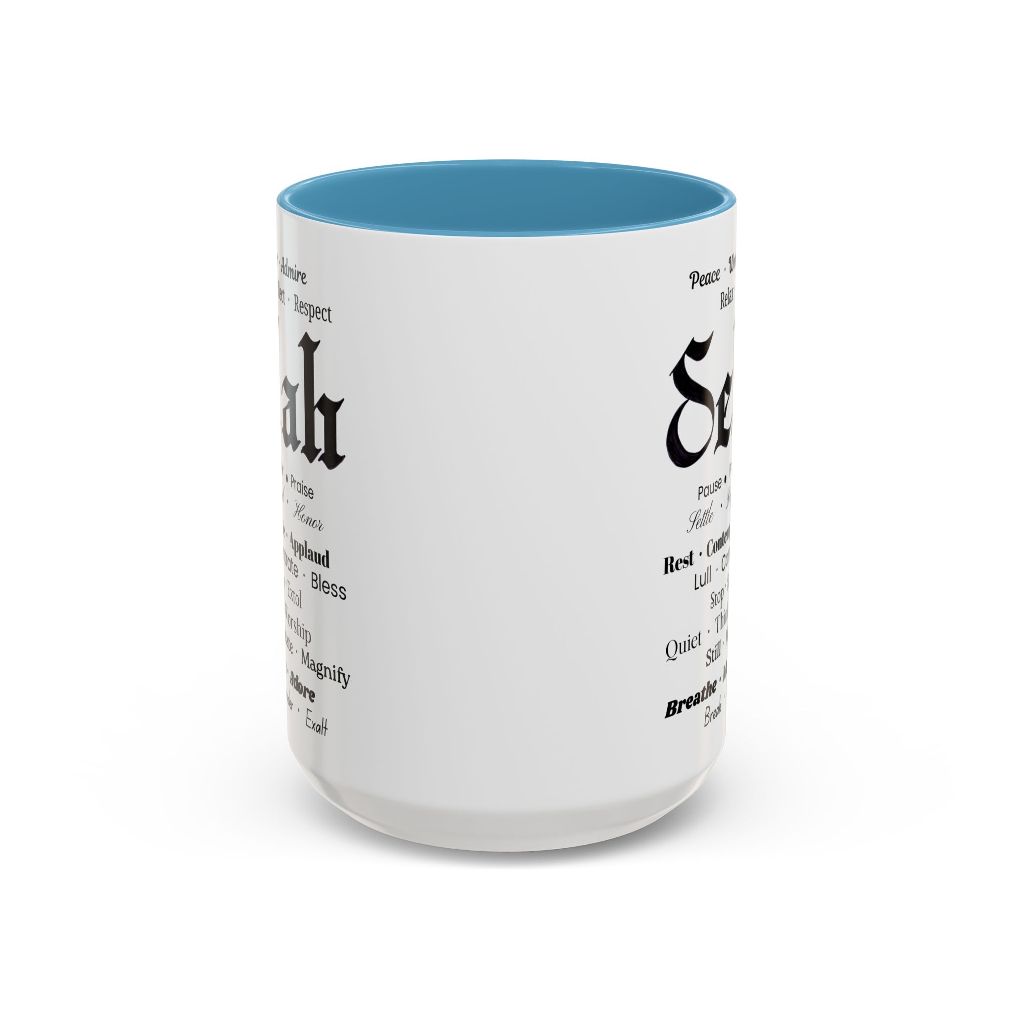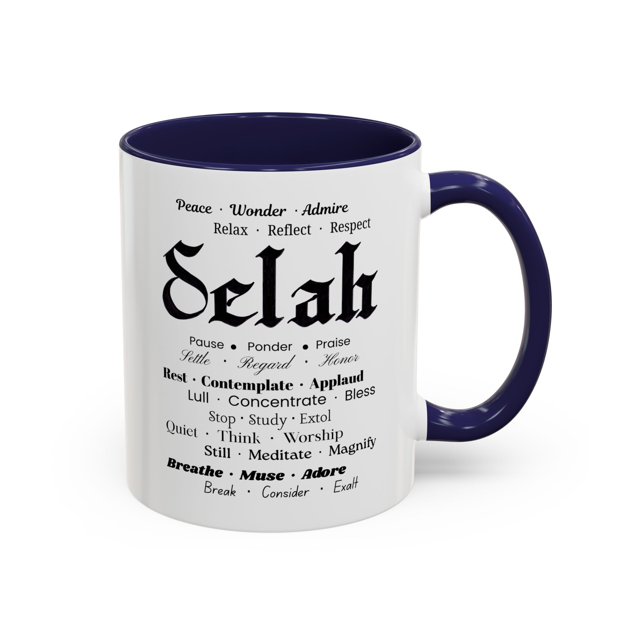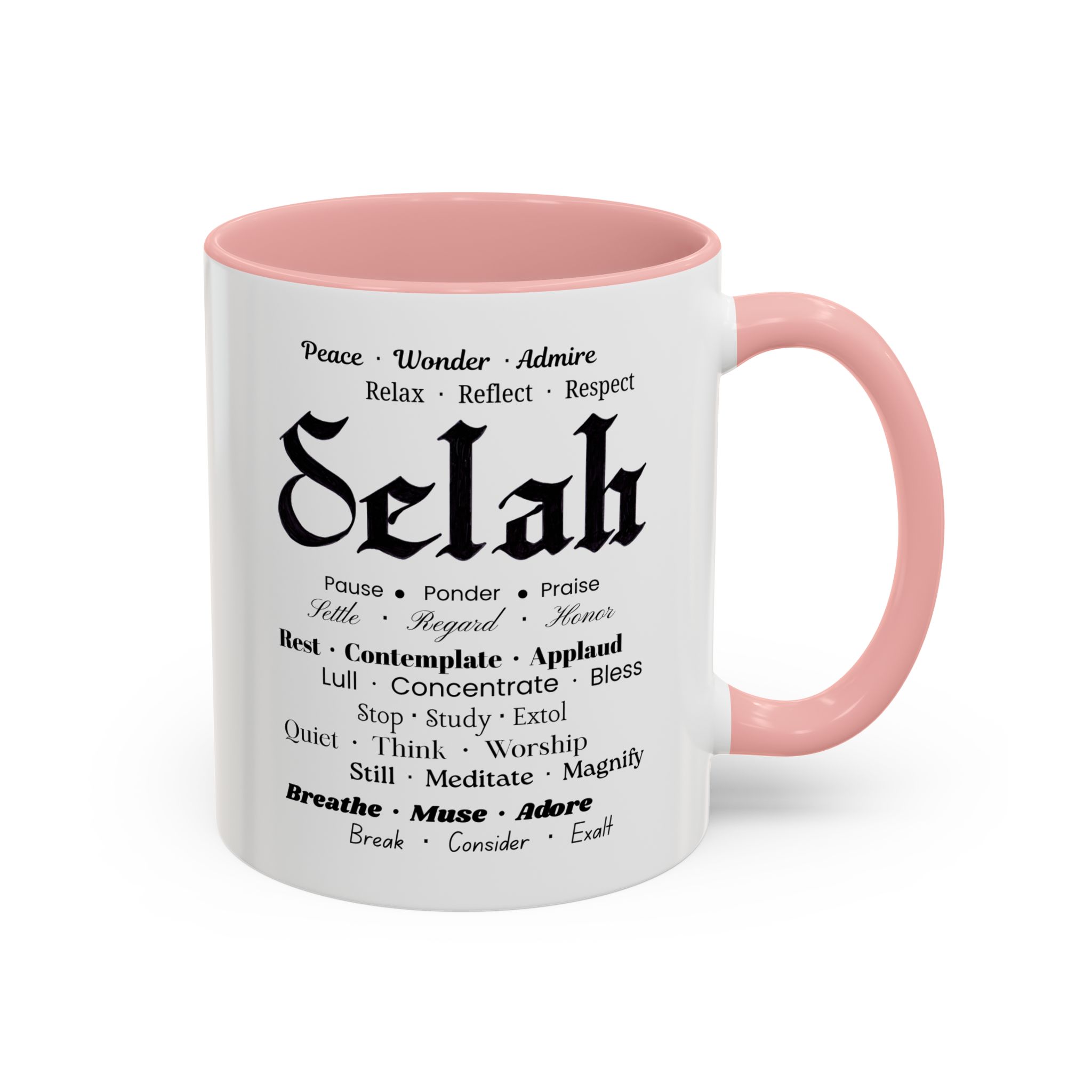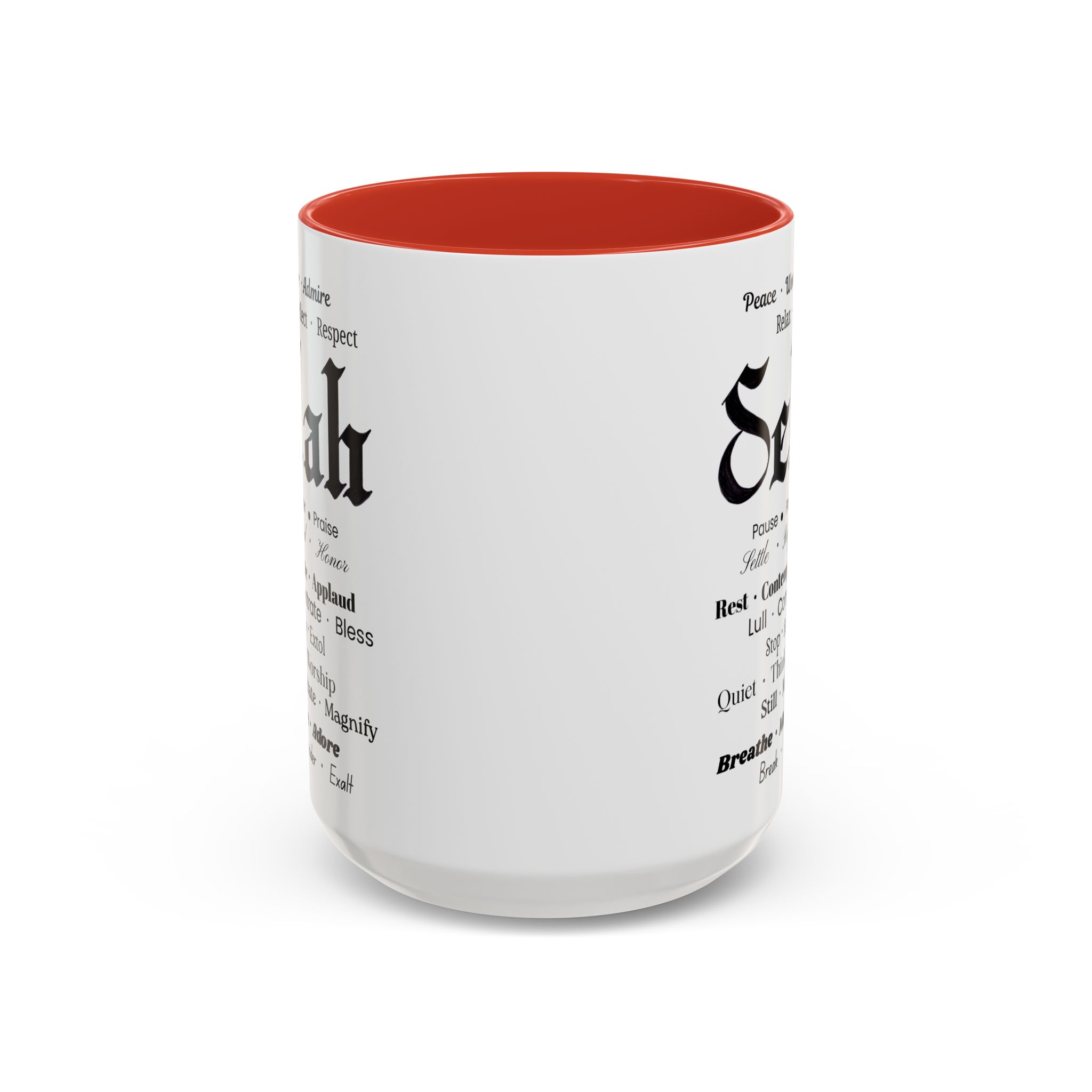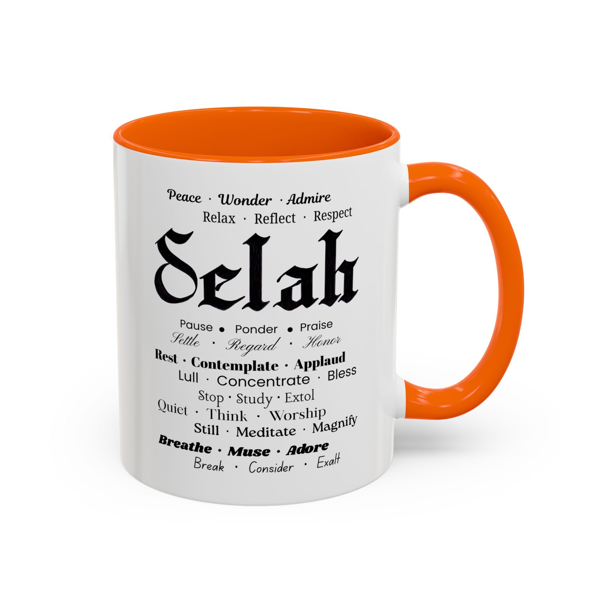 Christian inspirational ceramic coffee mug in two sizes and multiple color accent options. Original was hand lettered in Fraktur blackletter script, now printed with multiple three-words variations which hint at the significance of this one word: Selah. Delightful influence toward thoughtful thanksgiving for the God of creation. Perfect gift for someone who could use the prompts to relax and let their faith be inspired. Brighten your mornings with this vibrant, faith-inspiring ceramic coffee mug, designed to promote positive thoughts and elevate your morning coffee and Bible reading time. Its colorful interior and handle create an eye-catching contrast to the black and white design, adding a splash of fun to your day. Elegant yet practical, this mug makes for a wonderful cup of coffee, hot chocolate, or tea. Crafted from durable ceramic, this mug is both microwave and dishwasher safe, making it perfect for busy lifestyles. Ideal for coffee lovers and tea enthusiasts alike, it fits seamlessly into any home or office. Perfect for gifting on occasions such as birthdays, holidays, or just to uplift a friend. Embrace the bold colors and glossy finish, and let this mug be a conversation starter at your next gathering. Product features – Microwave-safe for convenient heating – Dishwasher-safe for easy cleaning – Vibrant colors from advanced printing techniques – Available in two sizes: 11oz and 15oz Multiple accent colors for the black on white design. – Lead and BPA-free for safe use Care instructions – Clean in dishwasher or wash by hand with warm water and dish soap