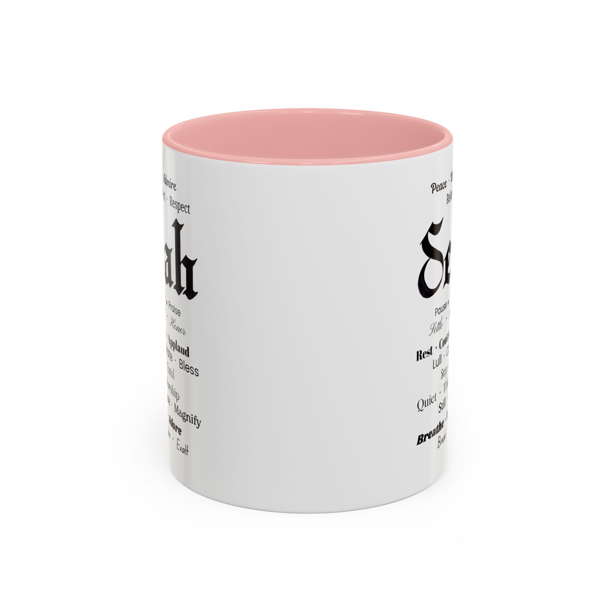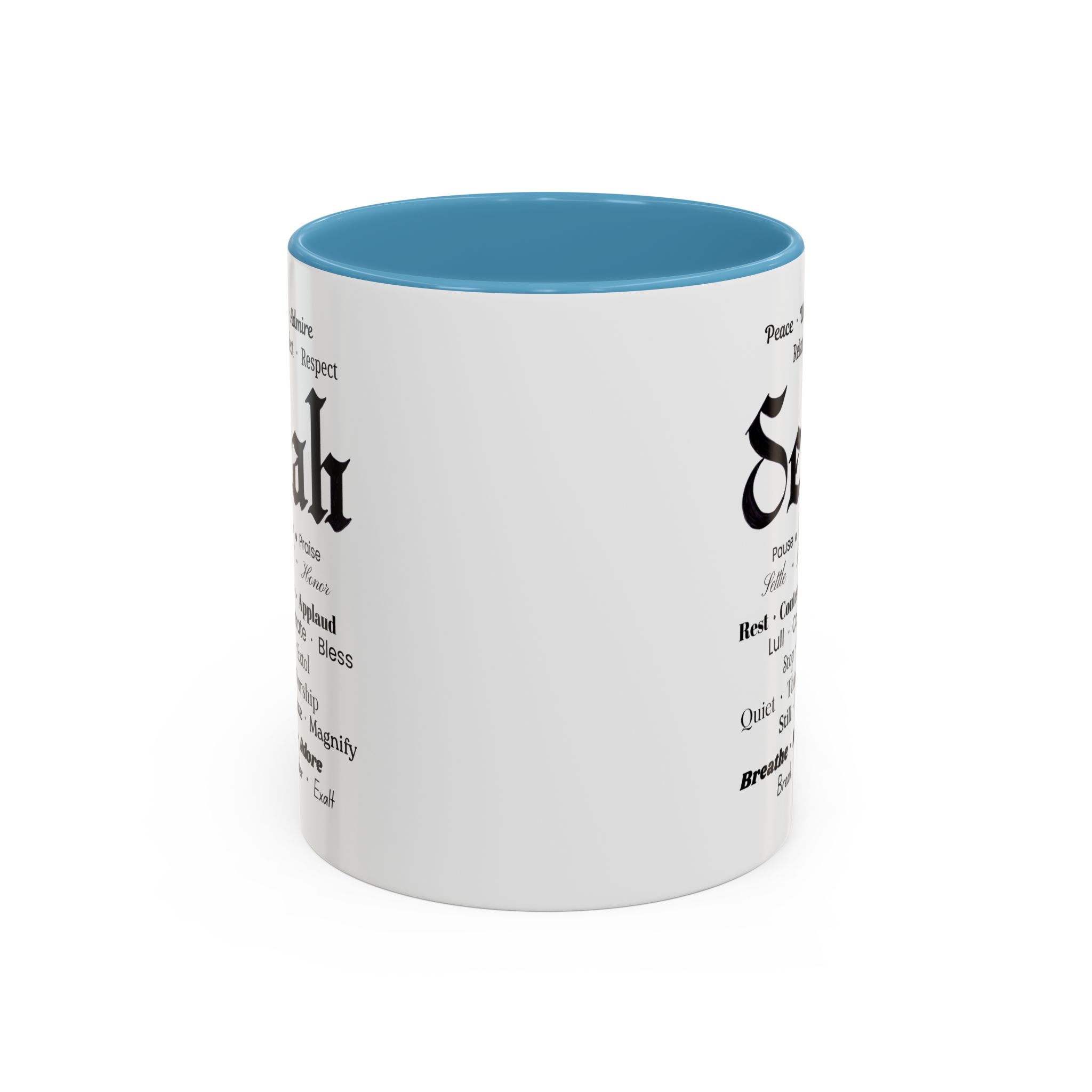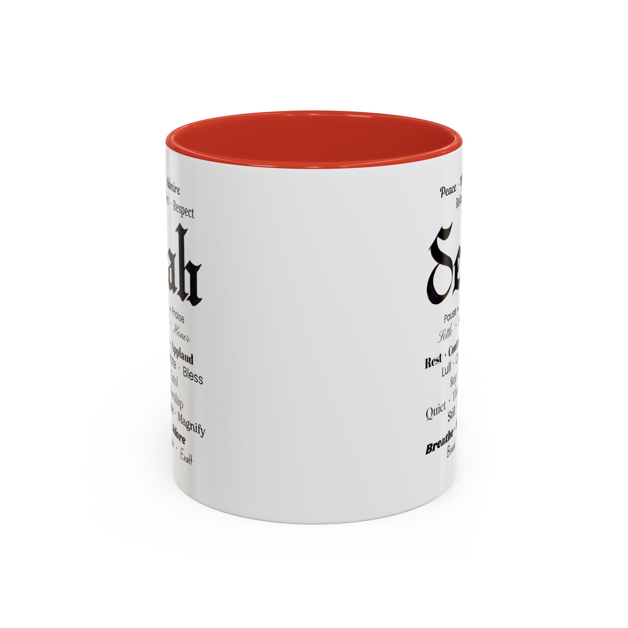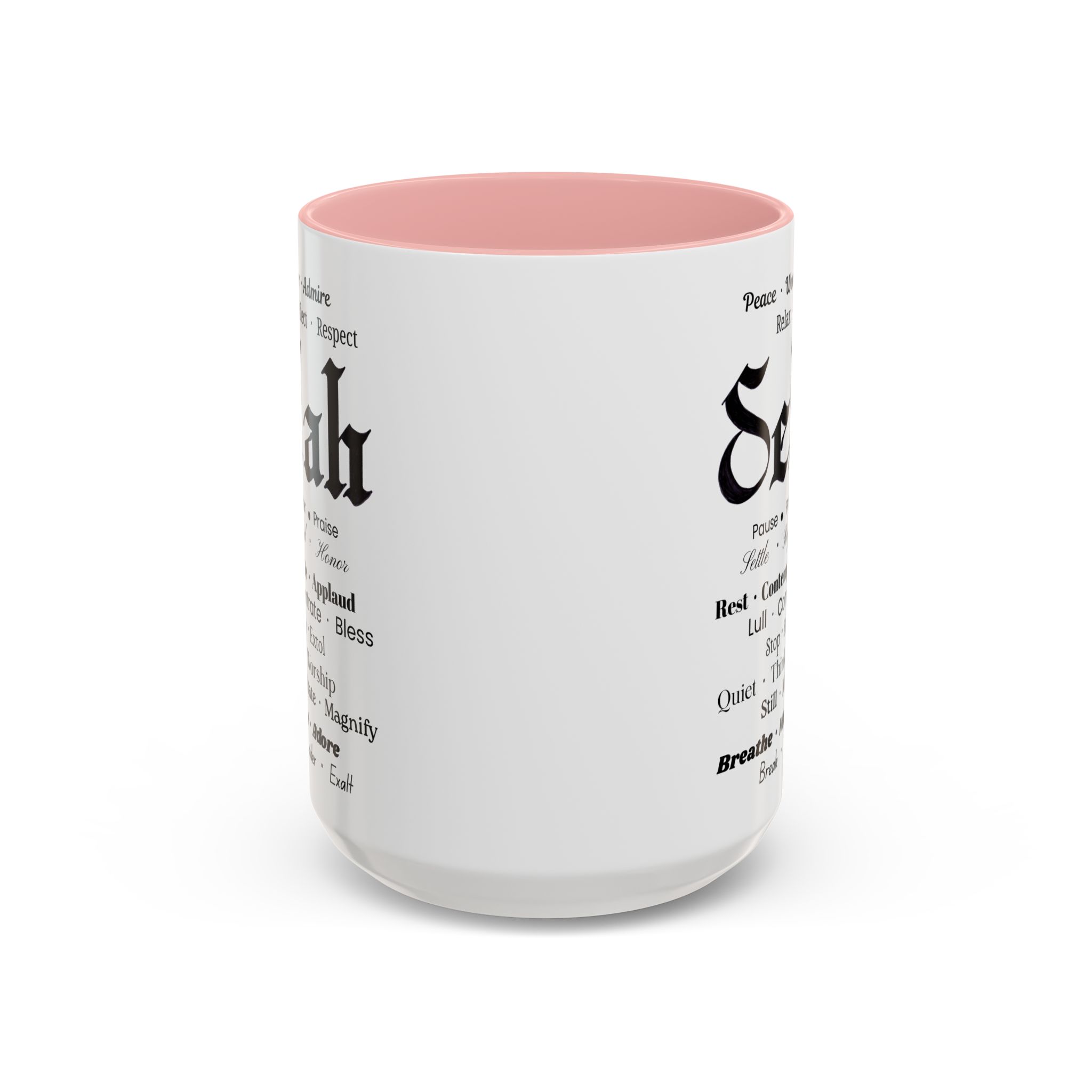 Christian inspirational ceramic coffee mug in two sizes and multiple color accent options. Original was hand lettered in Fraktur blackletter script, now printed with multiple three-words variations which hint at the significance of this one word: Selah. Delightful influence toward thoughtful thanksgiving for the God of creation. Perfect gift for someone who could use the prompts to relax and let their faith be inspired. Brighten your mornings with this vibrant, faith-inspiring ceramic coffee mug, designed to promote positive thoughts and elevate your morning coffee and Bible reading time. Its colorful interior and handle create an eye-catching contrast to the black and white design, adding a splash of fun to your day. Elegant yet practical, this mug makes for a wonderful cup of coffee, hot chocolate, or tea. Crafted from durable ceramic, this mug is both microwave and dishwasher safe, making it perfect for busy lifestyles. Ideal for coffee lovers and tea enthusiasts alike, it fits seamlessly into any home or office. Perfect for gifting on occasions such as birthdays, holidays, or just to uplift a friend. Embrace the bold colors and glossy finish, and let this mug be a conversation starter at your next gathering. Product features – Microwave-safe for convenient heating – Dishwasher-safe for easy cleaning – Vibrant colors from advanced printing techniques – Available in two sizes: 11oz and 15oz Multiple accent colors for the black on white design. – Lead and BPA-free for safe use Care instructions – Clean in dishwasher or wash by hand with warm water and dish soap