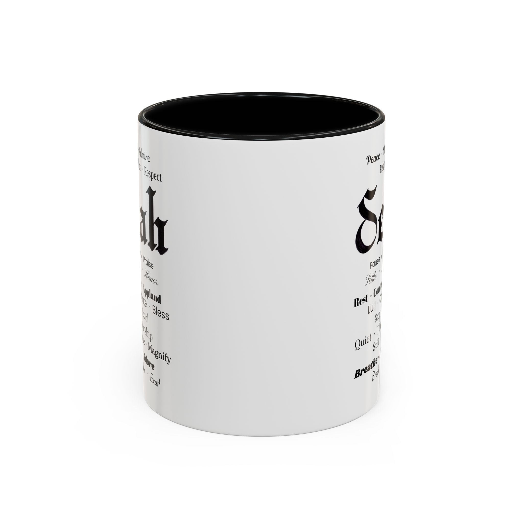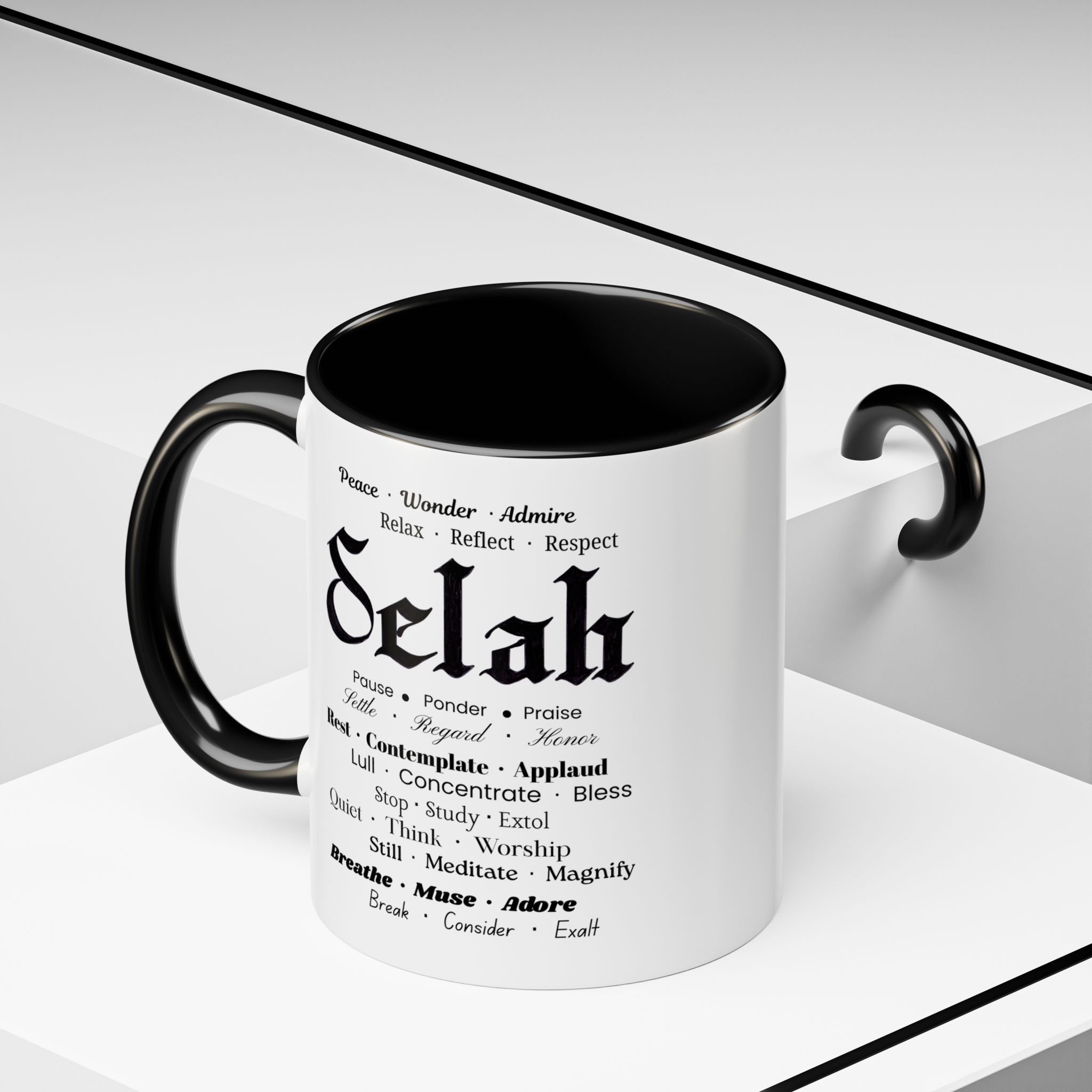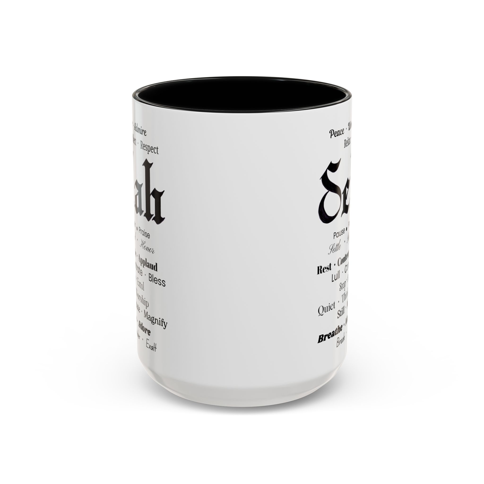 Christian inspirational ceramic color-accent coffee mug. Black/white: Selah in Fraktur Script, and meaningful word combos in various fonts.