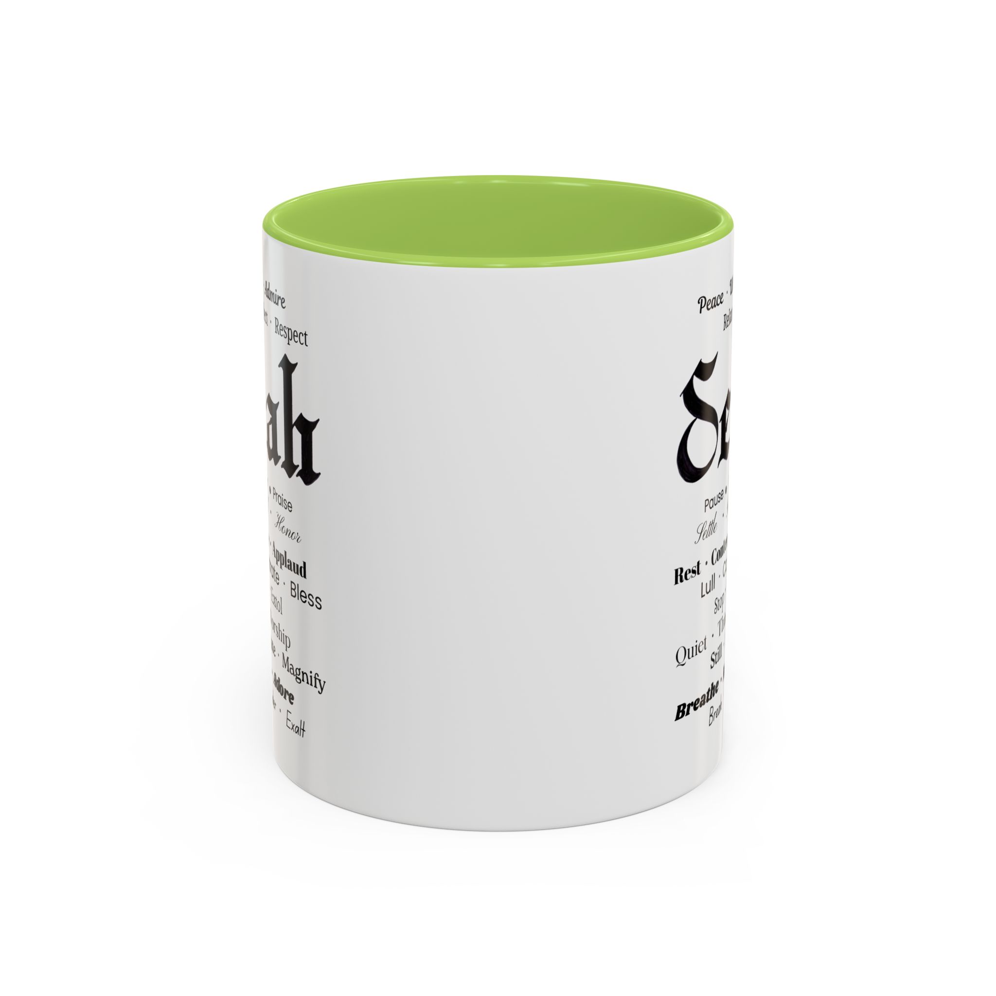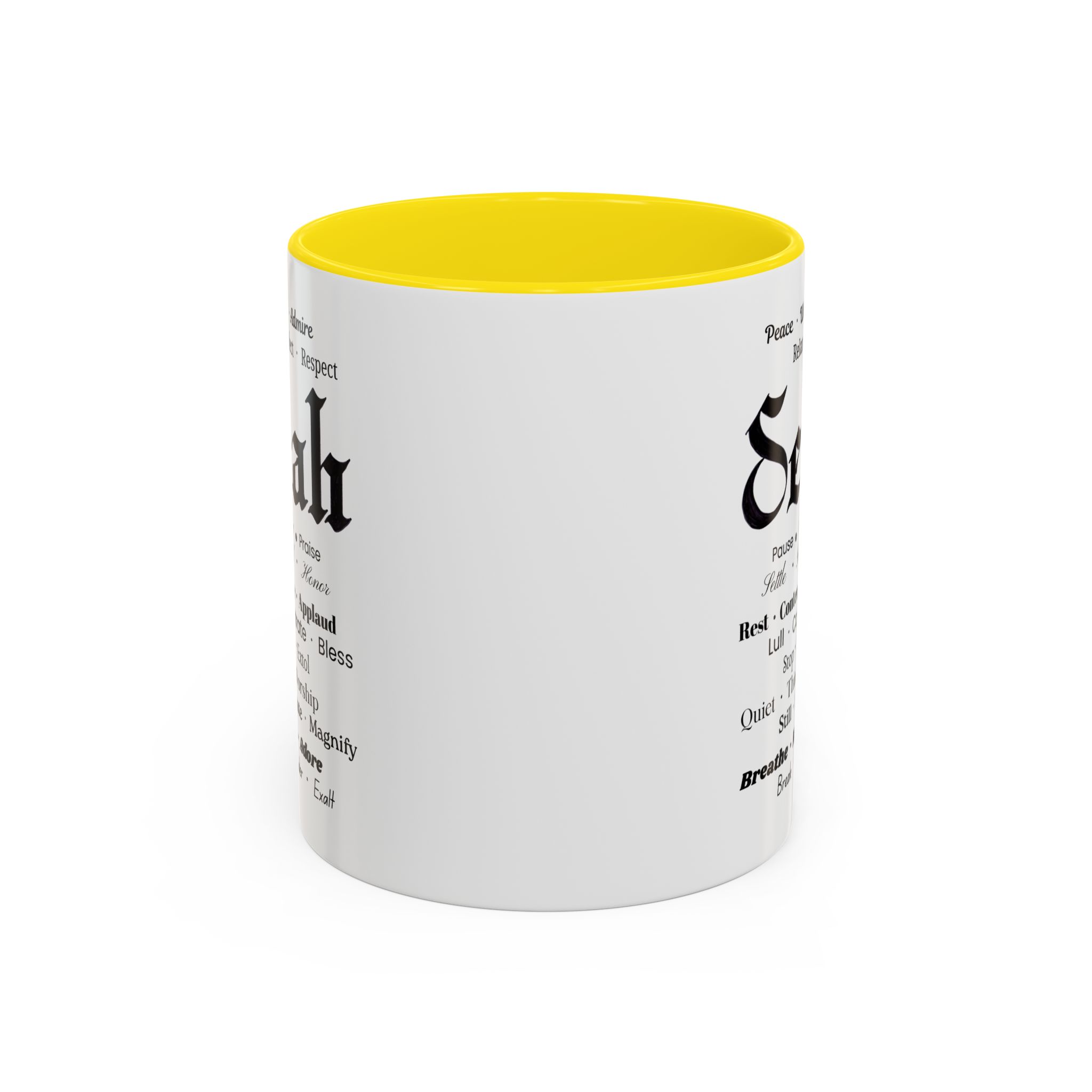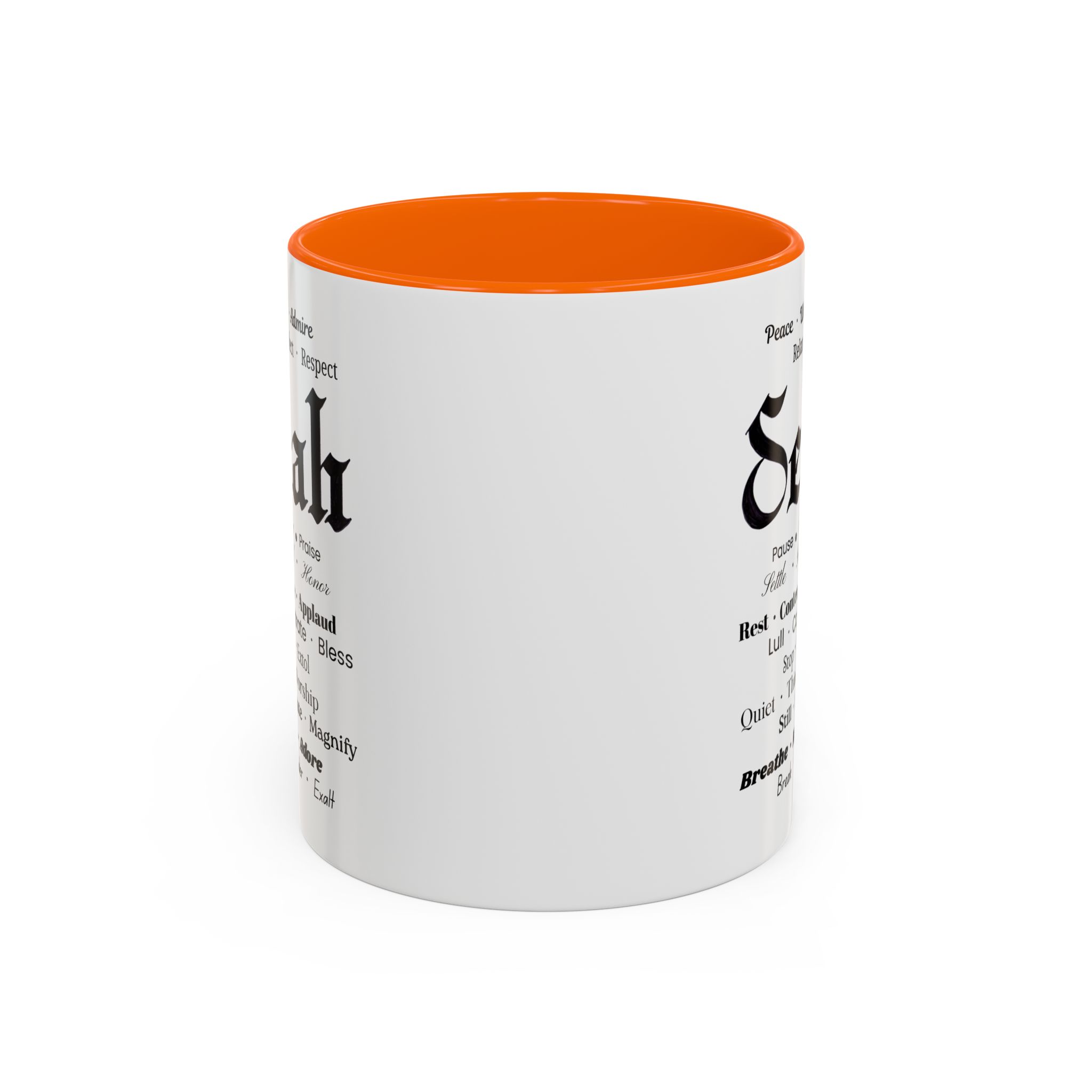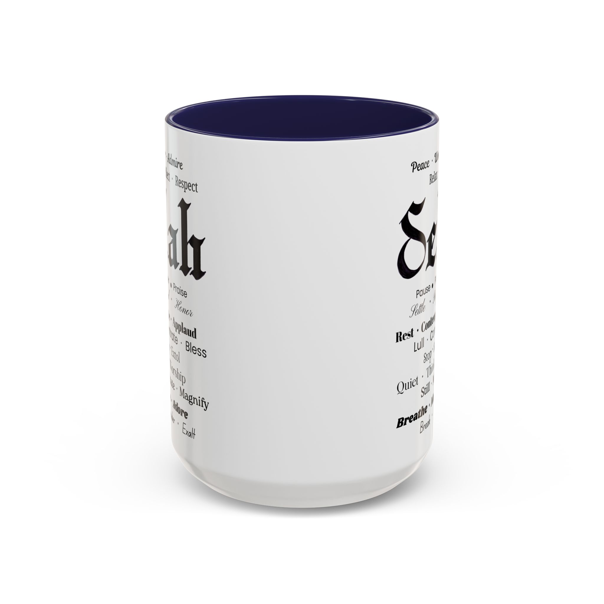 Christian inspirational ceramic color-accent coffee mug. Black/white: Selah in Fraktur Script, and meaningful word combos in various fonts.
