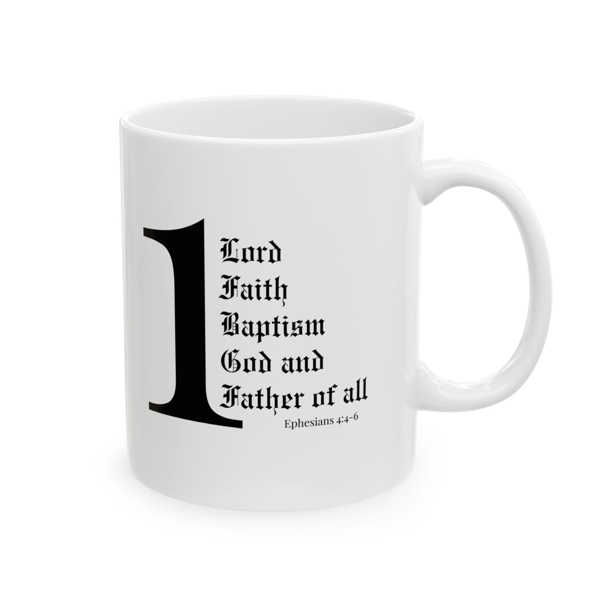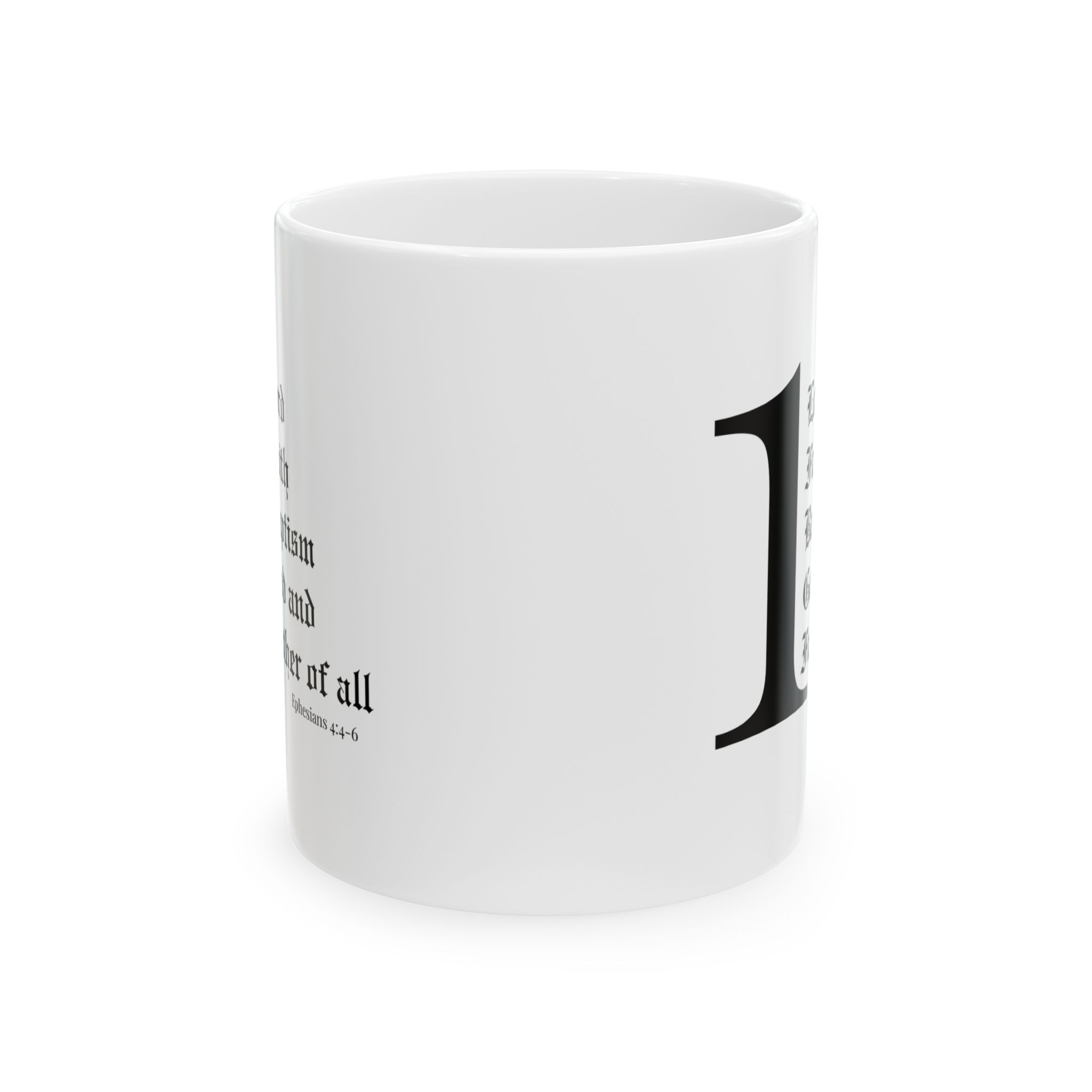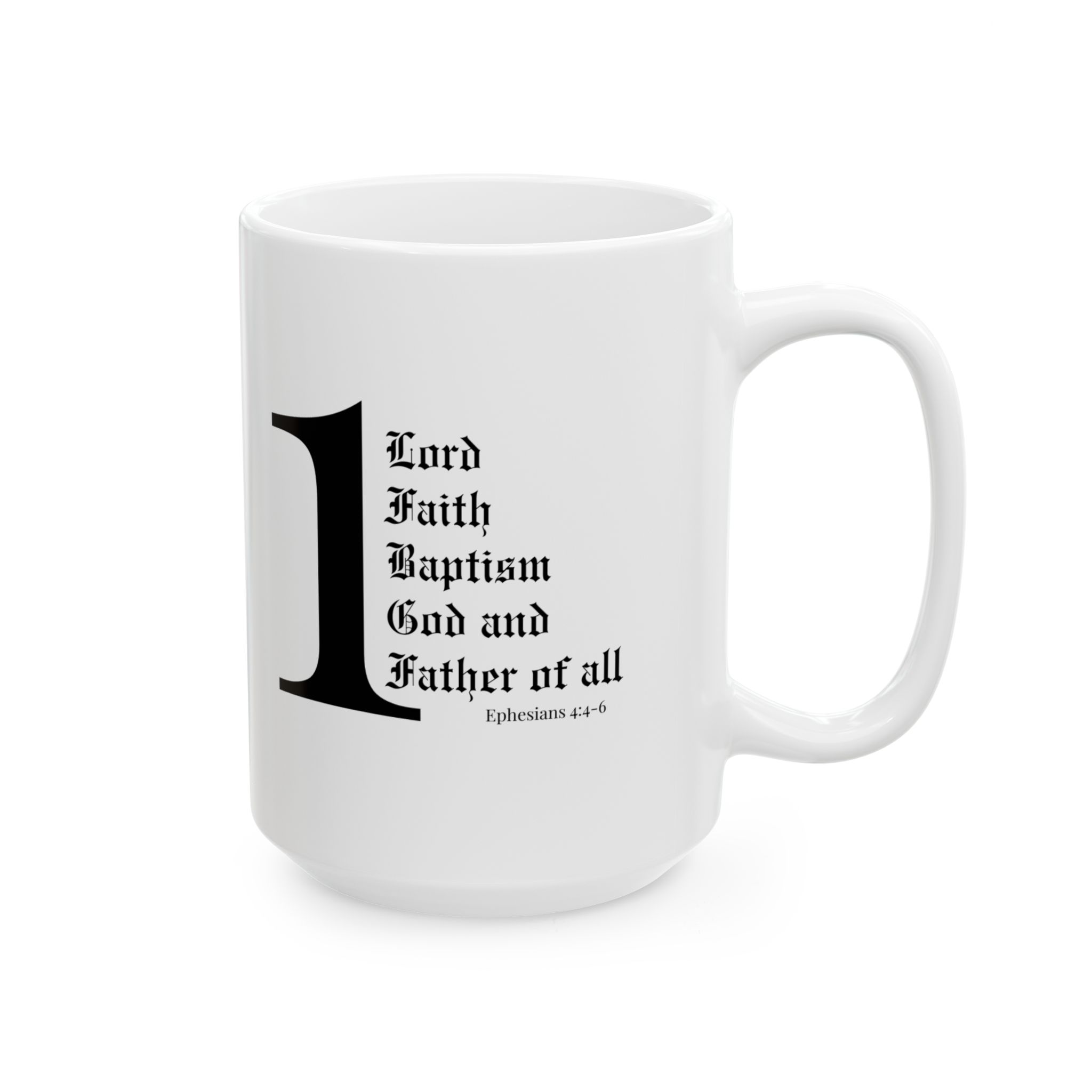 Christian ceramic mug with inspiring scripture design in black font, printed on front and back: One Lord, One Faith, One Baptism, One God and Father of all. Selected from Ephesians 4:4-6. Inspire faith for the ones you love most. Feed the soul while sipping hot chocolate, tea, or coffee. Every day is a day to love God, and this mug is perfect for believers looking to add a touch of inspiration to their routine. Ideal gift for new converts, graduations, Fathers Day, baptism, any holiday, or as a gift for a fellow Christian friend. Product features – Glossy ceramic finish – Vibrant colors – Microwave and dishwasher-safe – Available in 11oz and 15oz sizes – Lead and BPA-free Care instructions – Clean in dishwasher or wash by hand with warm water and dish soap. Washing by hand may prolong the new appearance of the print on your mug.