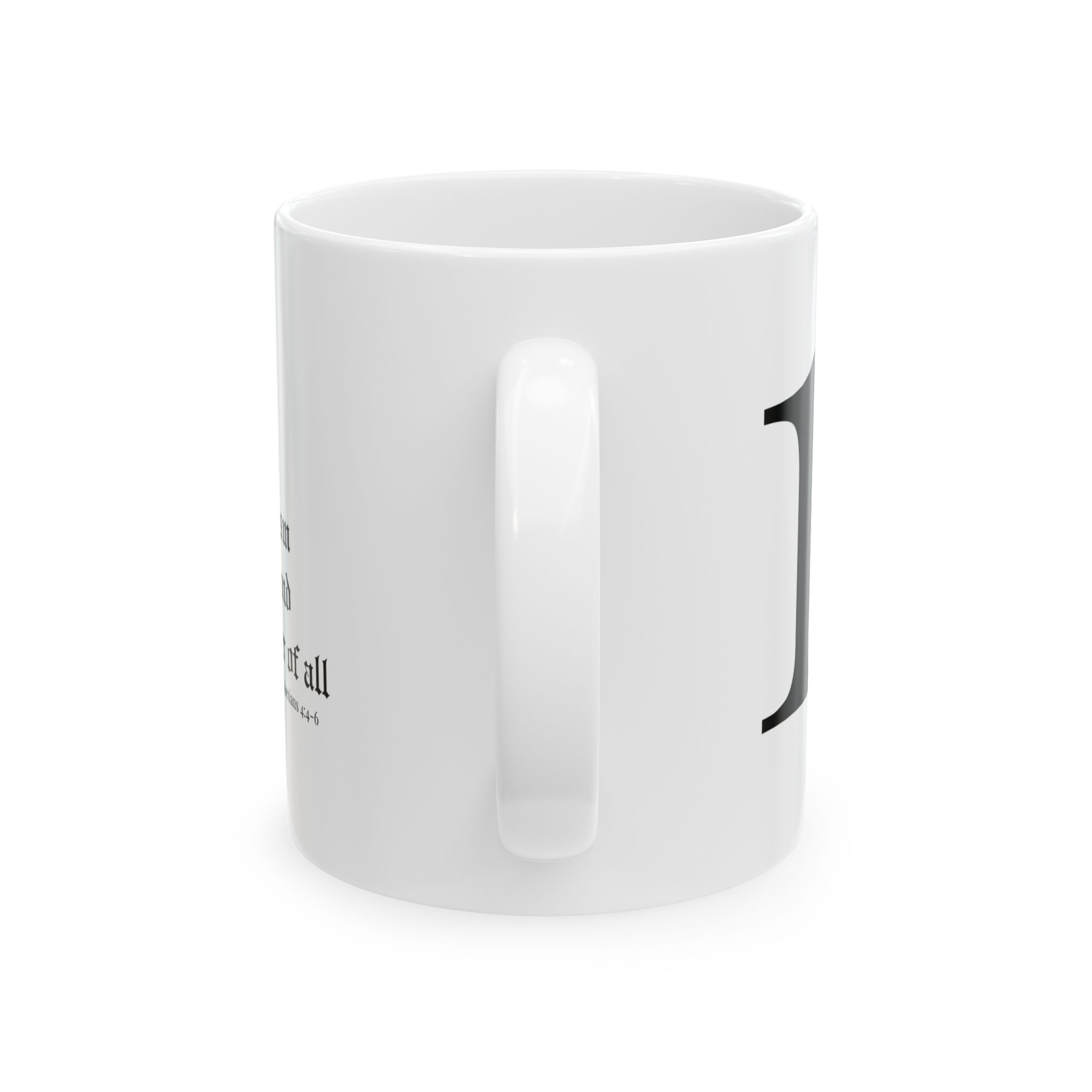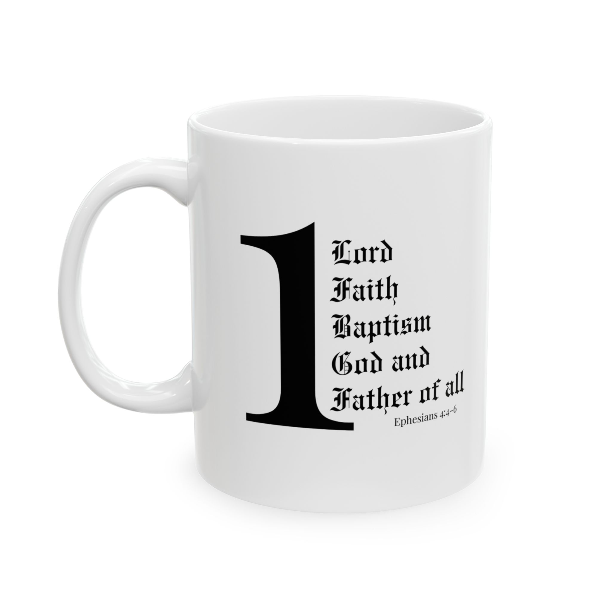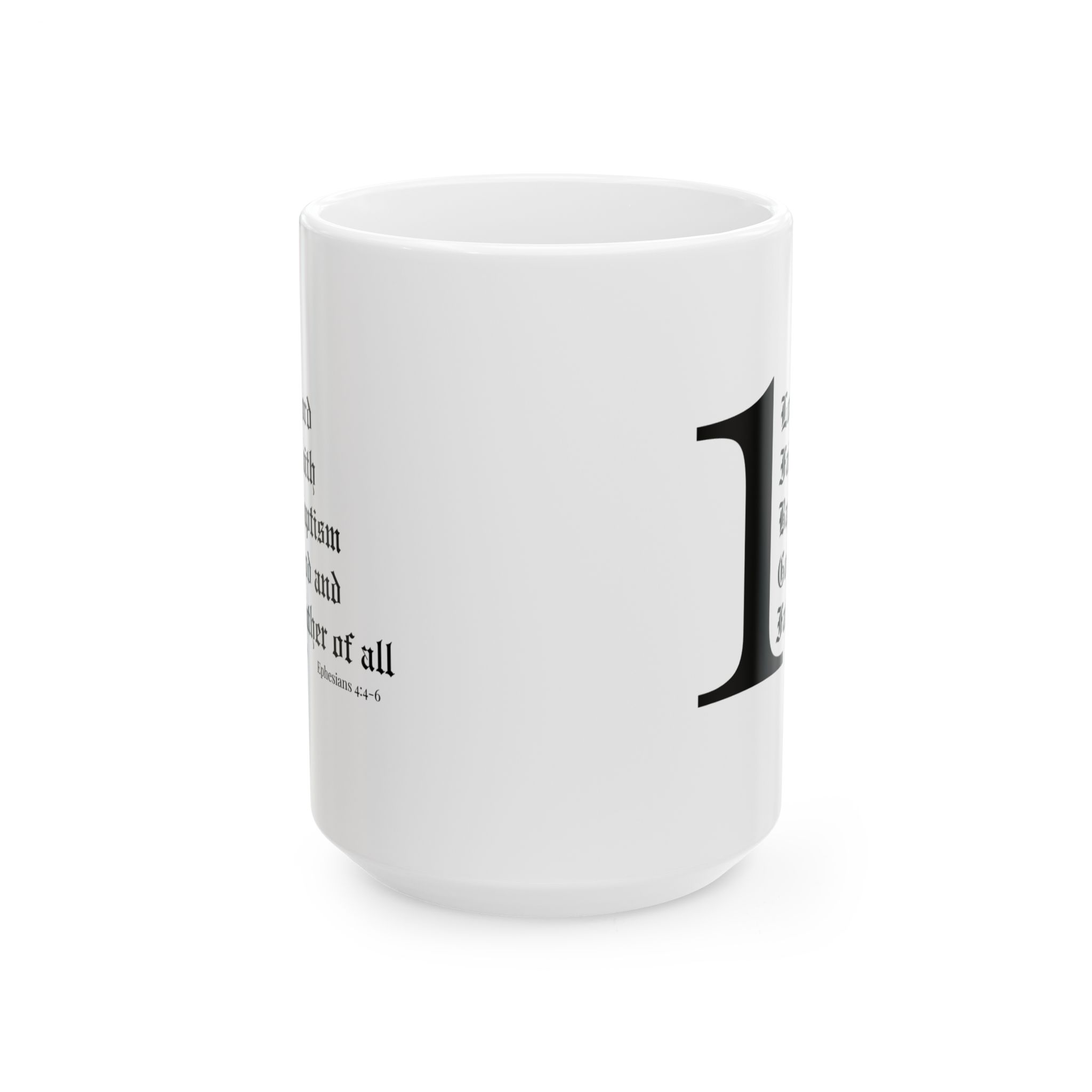 Christian ceramic mug with inspiring scripture design in black font, printed on front and back: One Lord, One Faith, One Baptism, One God and Father of all. Selected from Ephesians 4:4-6. Inspire faith for the ones you love most. Feed the soul while sipping hot chocolate, tea, or coffee. Every day is a day to love God, and this mug is perfect for believers looking to add a touch of inspiration to their routine. Ideal gift for new converts, graduations, Fathers Day, baptism, any holiday, or as a gift for a fellow Christian friend. Product features – Glossy ceramic finish – Vibrant colors – Microwave and dishwasher-safe – Available in 11oz and 15oz sizes – Lead and BPA-free Care instructions – Clean in dishwasher or wash by hand with warm water and dish soap. Washing by hand may prolong the new appearance of the print on your mug.